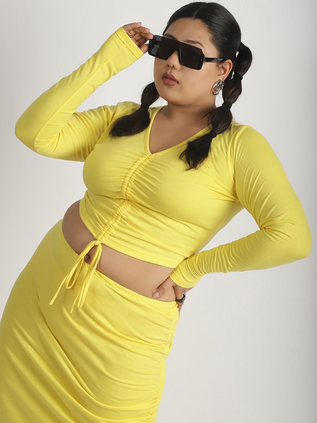 Calling all trendsetters! The Popstar Crop Top is here to take your wardrobe to the next level. This ultra-flattering top features a chic full-sleeve design with on-trend ruching details at the front for a touch of playful texture. The V-neckline adds a touch of sophistication, while the adjustable tie-up closure at the bottom allows you to customize the fit for a perfect silhouette.